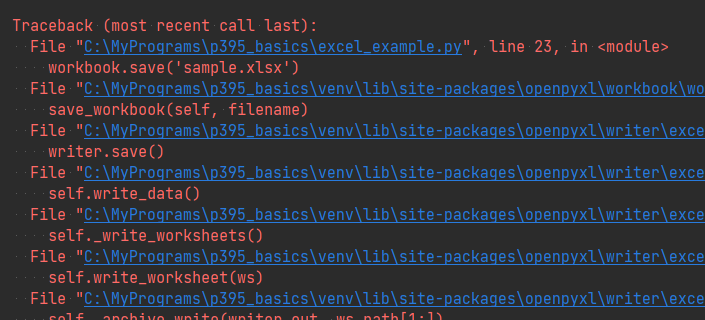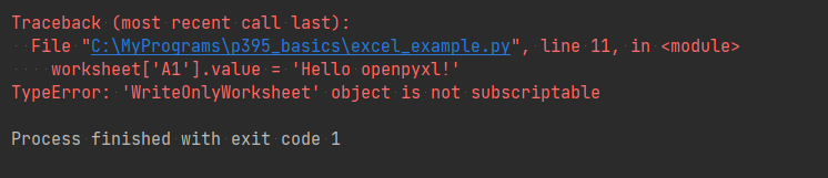 위 첫번째 파이썬 코드에서 Workbook 객체를 생성할 때 write_only=True로 정의한 후 실행하면 오류가 발생한다.