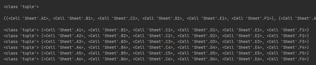 위의 코드에서 cells의 데이터 타입은 tuple이다. 이 cells를 for 문에 대입해서 얻는 데이터 또한 tuple 타입이다.