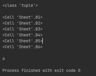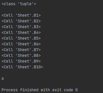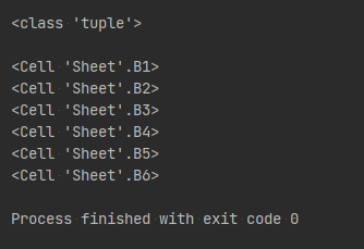 열을 기준으로 셀의 범위를 지정하면, 지정한 왼쪽 첫번째 열(B열)에 해당하는 셀들이 우선적으로 tuple로 묶여 반환된다.