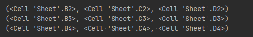 for rows in worksheet.iter_rows(min_row=2, max_row=4, min_col=2, max_col=4):