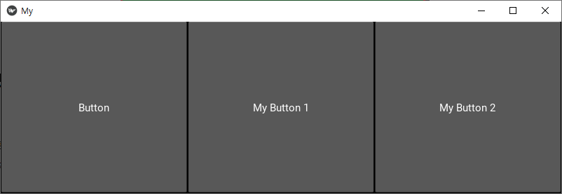 왼쪽 버튼 Button을 누르면, 가운데 및 오른쪽 버튼인 My Button 1과 My Button 2에 대한 on_touch_down 메서드가 호출되어 "My Button 2" 및 "My Button 1"이 출력된다.