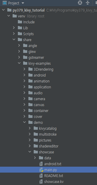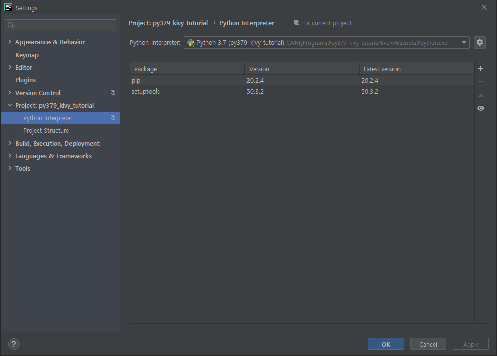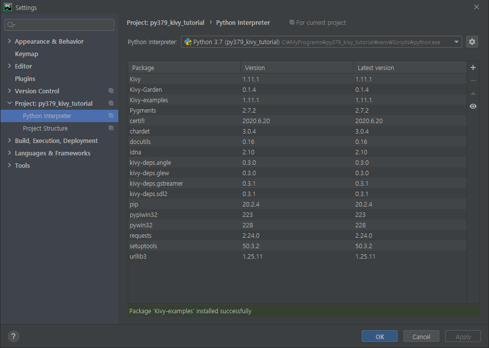 - 'kivy_'로 시작하는 패키지명은 PyCharm에서 'kivy-'로 검색해야 합니다.
