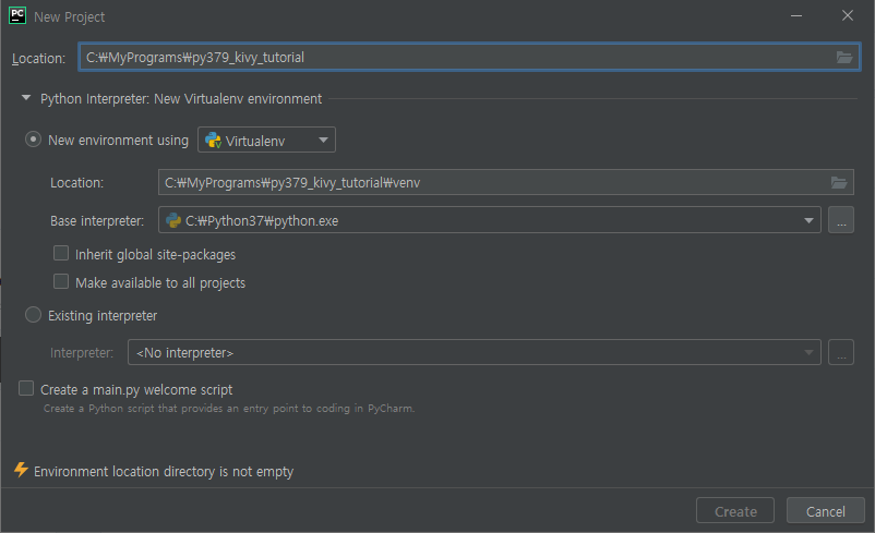 저는 kivy 기반 애플리케이션 개발 환경으로 PyCharm을 사용하기로 합니다. 개인 선호에 따라 필요 시 Jetbrains 홈페이지에서 PyCharm Community 버전을 다운받아 설치하고, 새로운 프로젝트를 만듭니다. 가상 환경의 Base Interpreter로 파이썬 3.7.9를 설정합니다; (이부분 -> Base interpreter : C\Python37\python.exe)