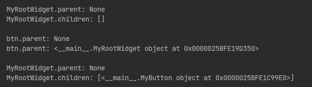 아래의 <코드 2>에서 MyRootWidget 클래스 객체는 MyButton 객체인 btn의 parent 위젯이고, MyButton 객체인 btn은 MyRootWidget 클래스 객체의 children 위젯이 된다.