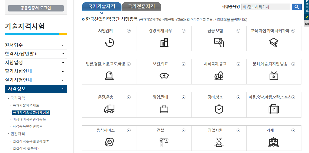 원하는 종목을 선택하면 관련 국가 기술 자격증의 종류를 확인할 수 있다.