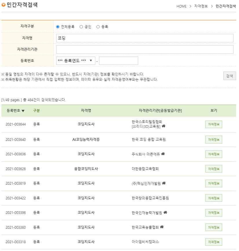 아래의 그림과 같이 민간자격정보서비스 사이트에서 "코딩"으로 검색하니 약 484개의 "코딩" 단어가 들어가는 민간 자격증이 검색된다.