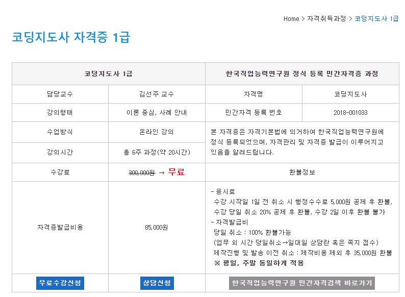 그중에서 한국직업능력진흥원(한국직업능력원격평생교육원)의 코딩지도사 자격증 1급을 추가로 검색해 본다.