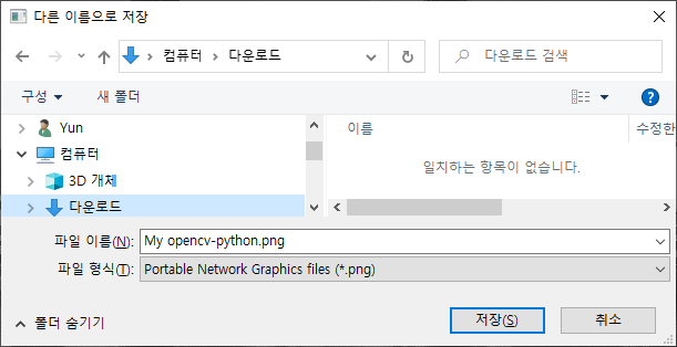 imshow() 함수에 의해 임의 이미지가 화면에 출력되고 있는 상태에서 Ctrl + s 키를 누르면, 해당 이미지를 저장할 수 있는 창이 열린다.