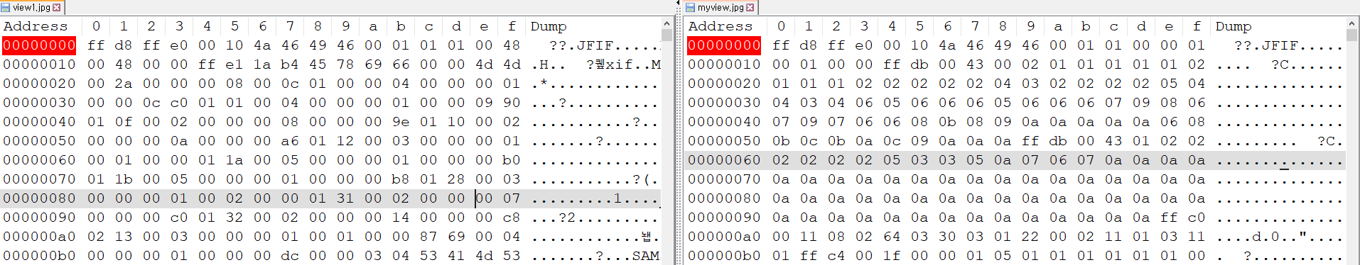 Hex Editor로 두 이미지 파일의 데이터를 비교해 보면 같지 만은 않다.