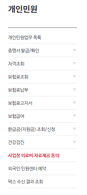 4. "개인민원"의 하위 메뉴 "사업장 의료비 자료제공 동의"를 클릭한다.