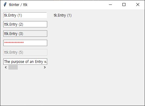 화면에서 tkinter.Entry 및 ttk.Entry는 위의 이미지와 같이 보입니다.