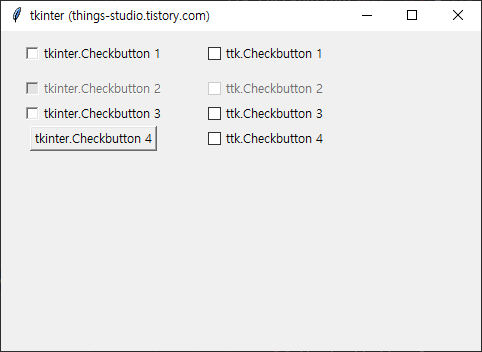 - tkinter.Checkbutton엔 Checkbutton 위젯 자체에 상태값을 바꾸는 메서드 select()가 있으나 ttk.Checkbutton은 이를 지원하지 않습니다.