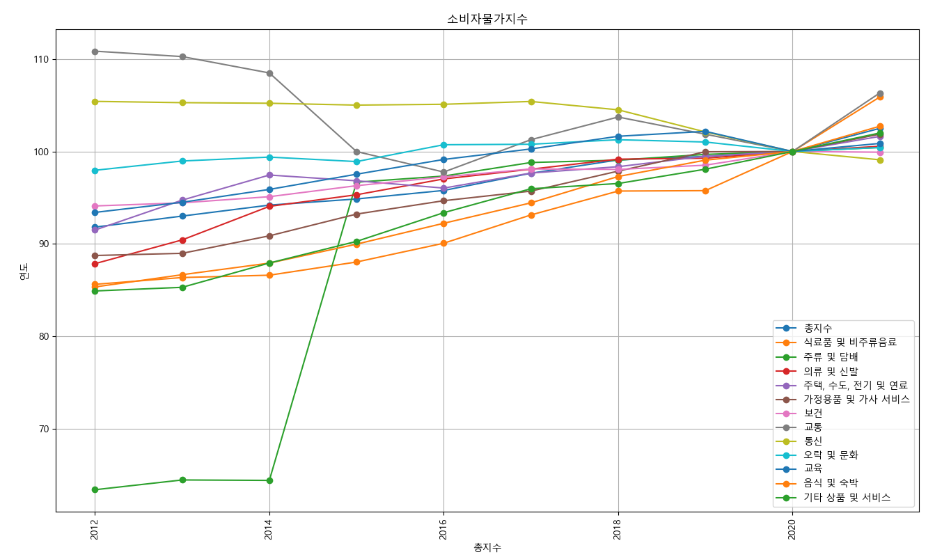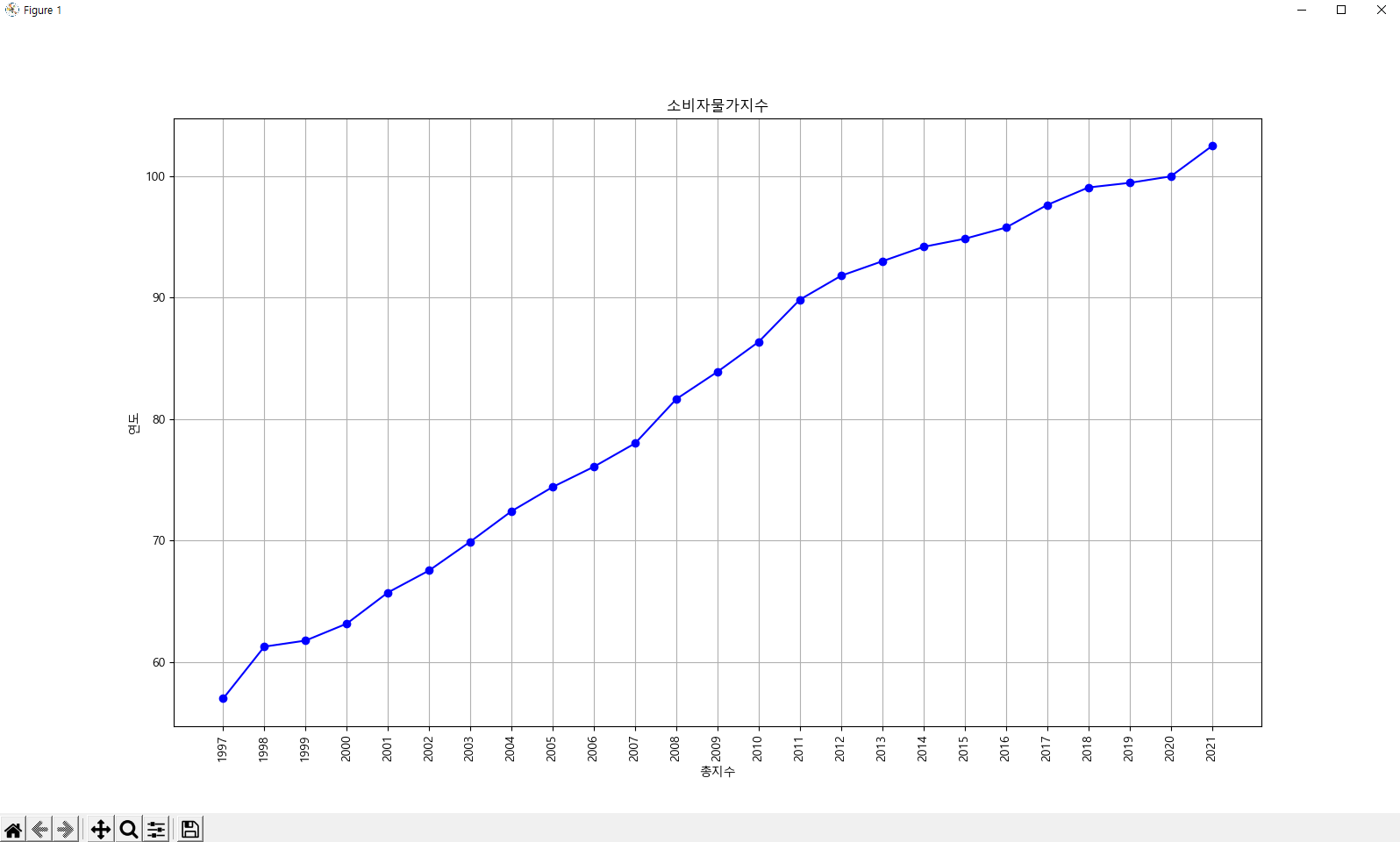 그래프로 그리는 데이터는 한국은행에서 제공하는 소비자물가지수 정보입니다.