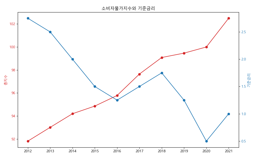 부록 2. matplotlib로 연도 별 소비자물가지수와 기준금리 비교하기