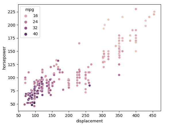 아래는 "mpg" 데이터셋의 displacement, horsepower, mpg 데이터 간의 연관성을 보여줍니다.